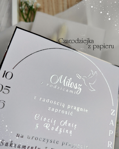 Treść zaproszenia drukowana jest w srebrnym kolorze, co pięknie komponuje się z całą, bardzo jasną i elegancką stylistyką zaproszenia.