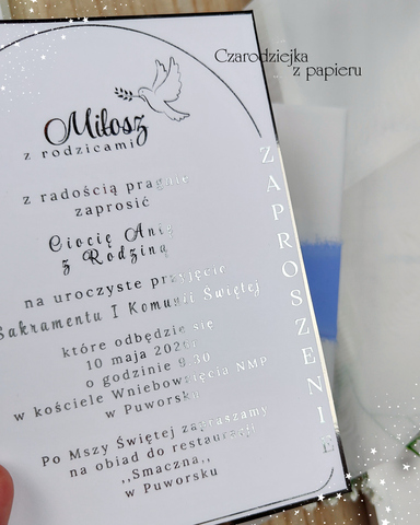 Zaproszenie na Pierwszą Komunię Świętą – otulone kalką, ze srebrnymi elementami i suszonymi trawami
