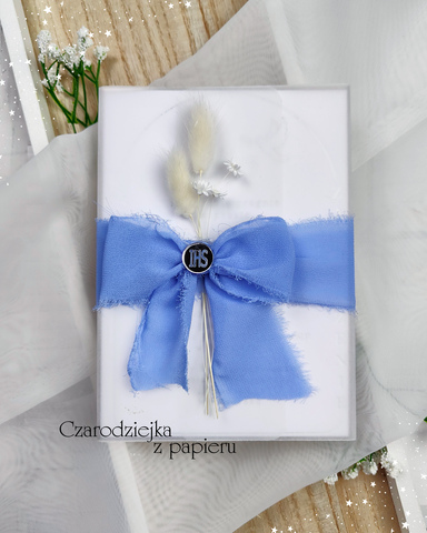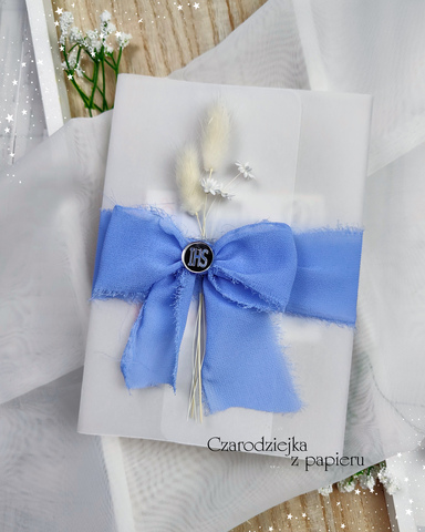 Zaproszenie zostało otulone kalką, a całość przewiązana jest szeroką, ręcznie wiązaną wstążką.
