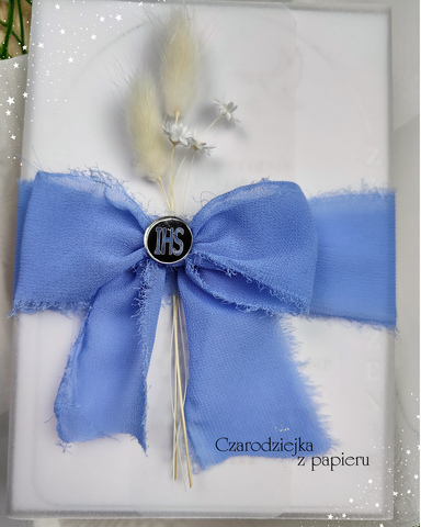 Ozdobą zaproszenia są suszone trawy i delikatne kwiatuszki oraz srebrny element z pleksi z symbolem IHS.