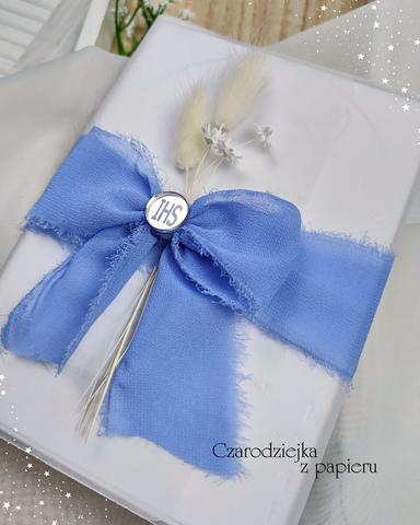 Połączenie kalki, ręcznie wiązanej wstążki, suszonych traw oraz srebrnych dodatków tworzy wyjątkową i bardzo efektowną kompozycję.