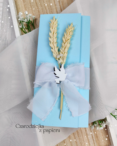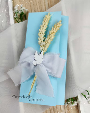 Zaproszenie na Pierwszą Komunię Świętą – składane DL, z kokardą, gołębicą i suszonymi trawami