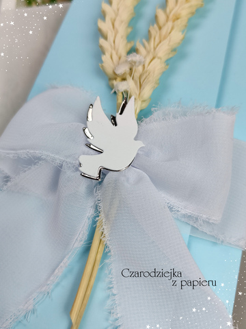 Zaproszenie po złożeniu ma format DL i przewiązane jest szeroką, ręcznie wiązaną wstążką, ozdobioną dekoracyjną gołębicą w kolorze białym ze srebrnym wykończeniem