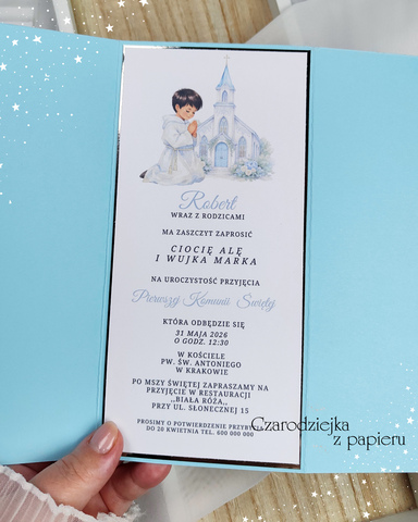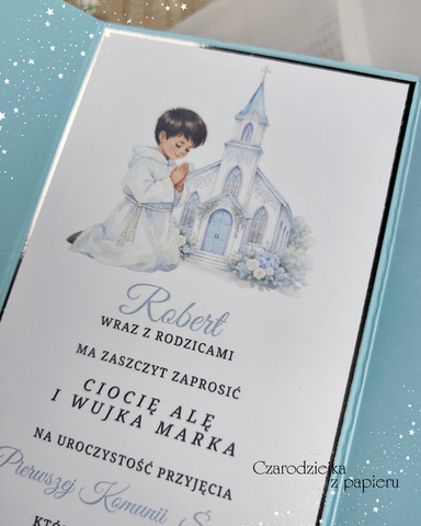 Eleganckie i bardzo efektowne zaproszenie na Pierwszą Komunię Świętą w formie zaproszenia składanego.