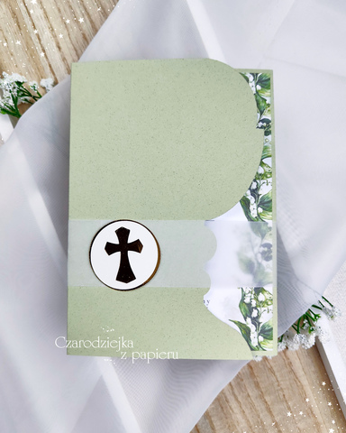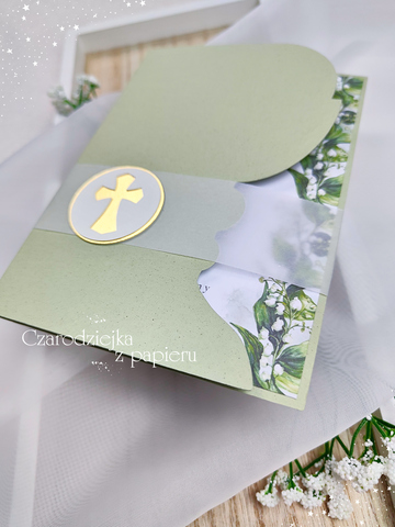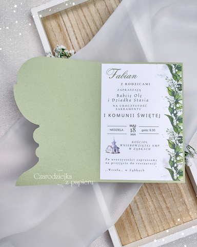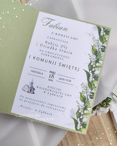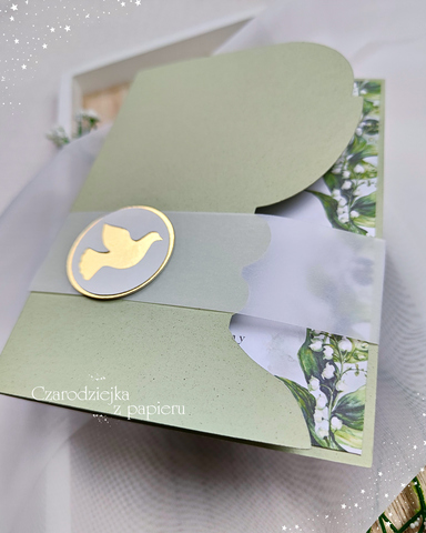 Eleganckie, minimalistyczne zaproszenie w kolorze zielonym z delikatną kalką i złotym symbolem komunijnym.