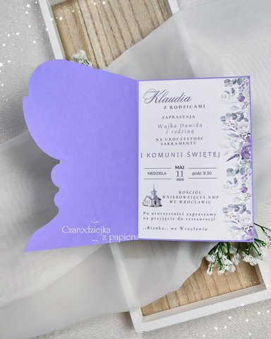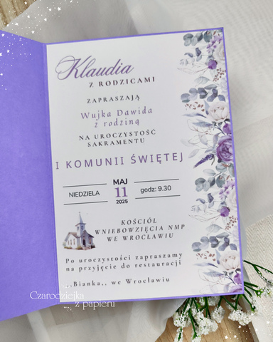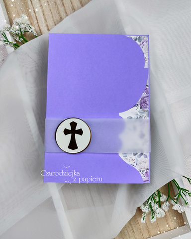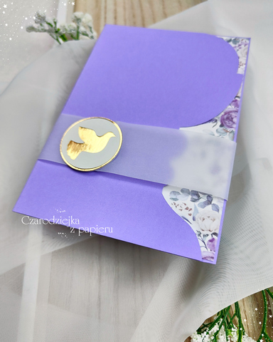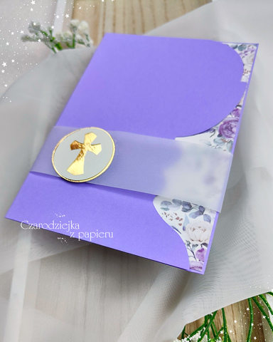 Eleganckie, minimalistyczne zaproszenie w kolorze ciemnego fioletu z delikatną kalką i złotym symbolem komunijnym.