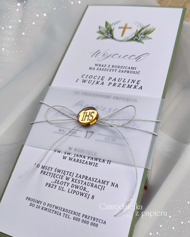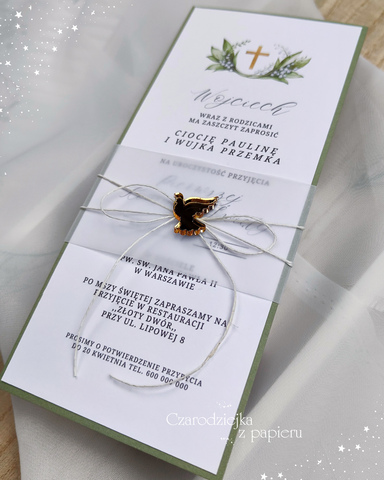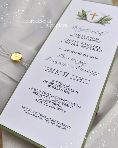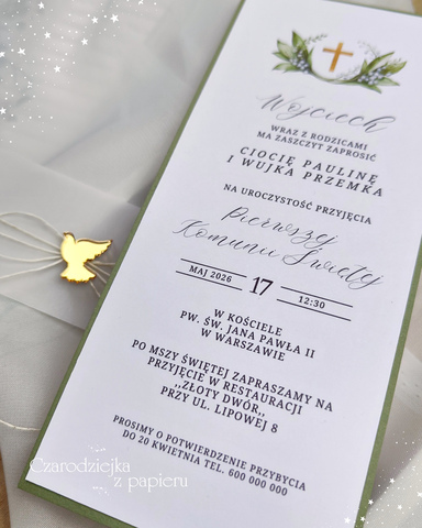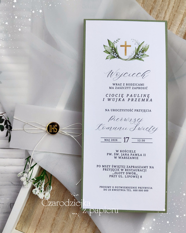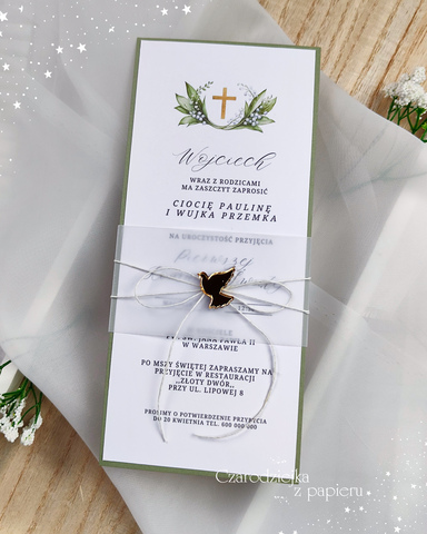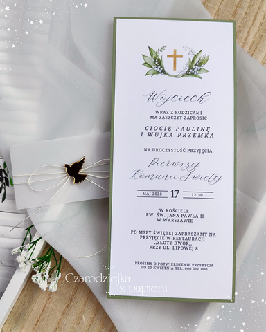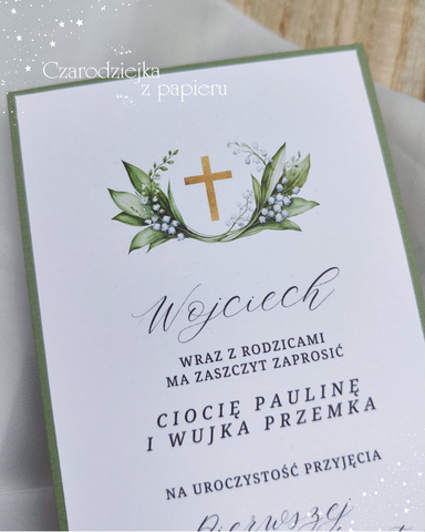Eleganckie, jednokartkowe z z delikatną grafiką konwalii i złotego krzyża – symbolami czystości i duchowej świeżości.