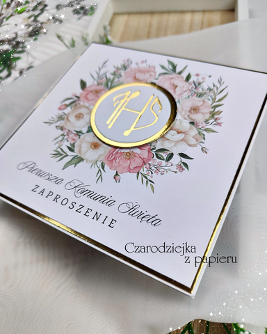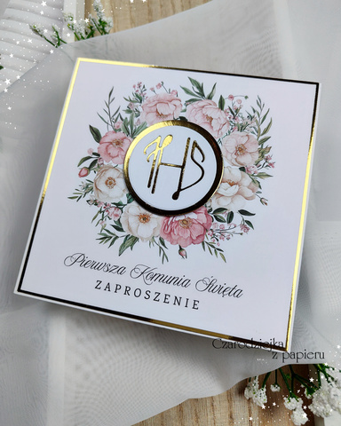 Klasyczne, kwadratowe zaproszenie komunijne z centralnym medalionem IHS, otoczonym eleganckim wiankiem w ciepłych odcieniach brzoskwini, pudrowego różu i subtelnej zieleni.