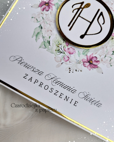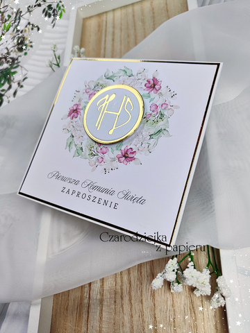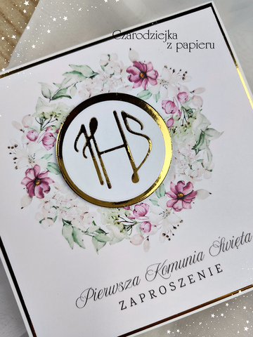 Eleganckie, kwadratowe zaproszenie komunijne z centralnym medalionem IHS, otoczonym romantycznym wiankiem w odcieniach różu i delikatnej zieleni.