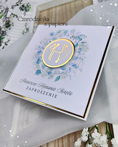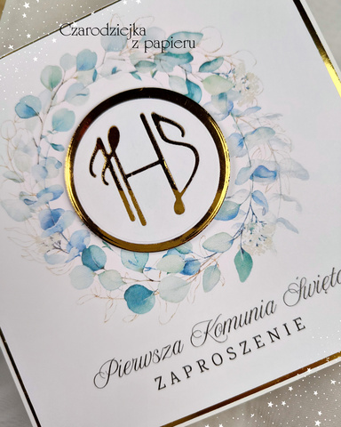 Eleganckie, kwadratowe zaproszenie komunijne z centralnym medalionem IHS, otoczonym subtelnym wiankiem w odcieniach eukaliptusowej zieleni i delikatnego błękitu.