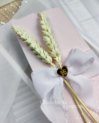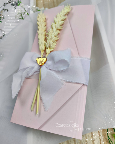 Front zaproszenia zdobi dekoracyjna wstążka oraz symboliczny akcent w postaci kłosów z medalionem IHS, tworząc kompozycję pełną klasy i delikatności.