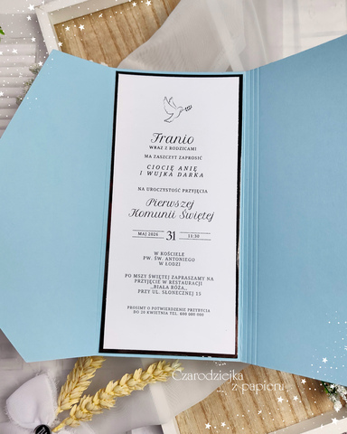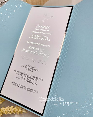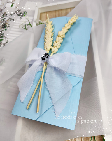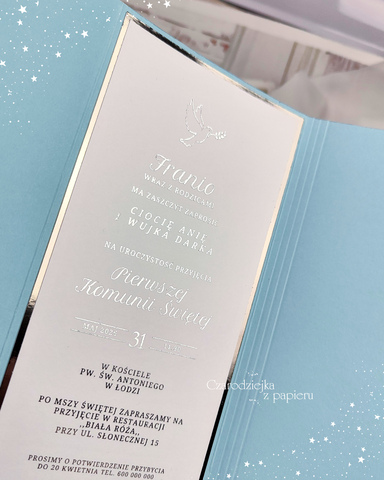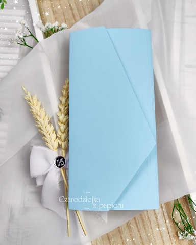 Eleganckie, składane zaproszenie w formie kopertowego folderu w subtelnym, chłopięcym odcieniu błękitu.