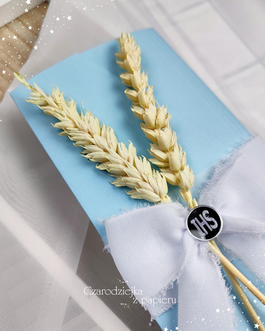 Front zaproszenia zdobi dekoracyjna wstążka oraz symboliczny motyw kłosów z medalionem IHS w srebrnym wykończeniu – kompozycja subtelna, klasyczna i bardzo harmonijna.