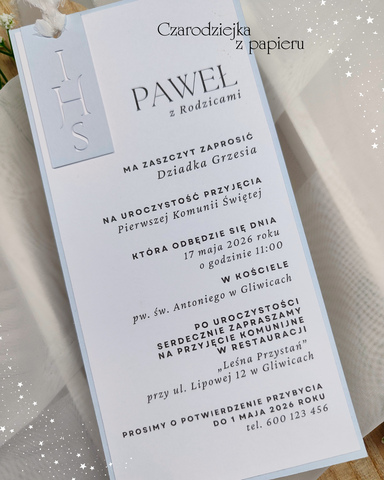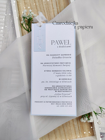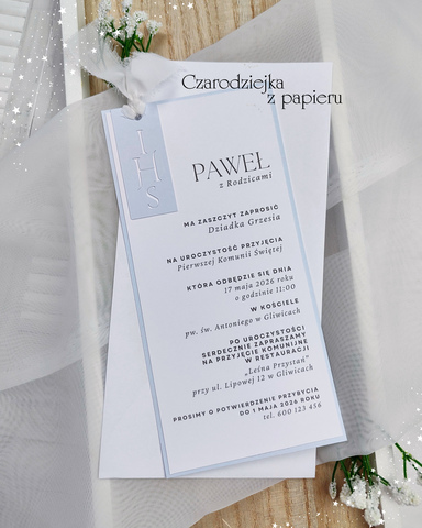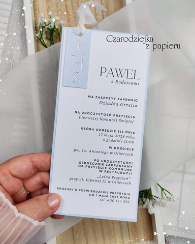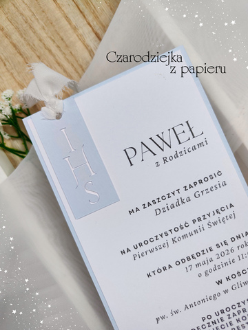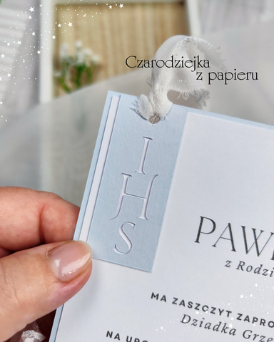 Charakterystycznym elementem zaproszenia jest ozdobna niebieska zawieszka z wyciętym symbolem IHS, przewiązana delikatną, zwiewną wstążką.